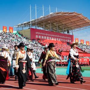 當日,青海省海南藏族自治州舉行慶祝成立70周年大會。海南州民族體育場彩旗飄飄,歌聲悠揚,各族群眾身着盛裝,滿懷喜悅。