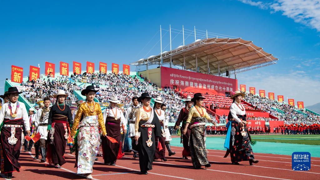 當日,青海省海南藏族自治州舉行慶祝成立70周年大會。海南州民族體育場彩旗飄飄,歌聲悠揚,各族群眾身着盛裝,滿懷喜悅。