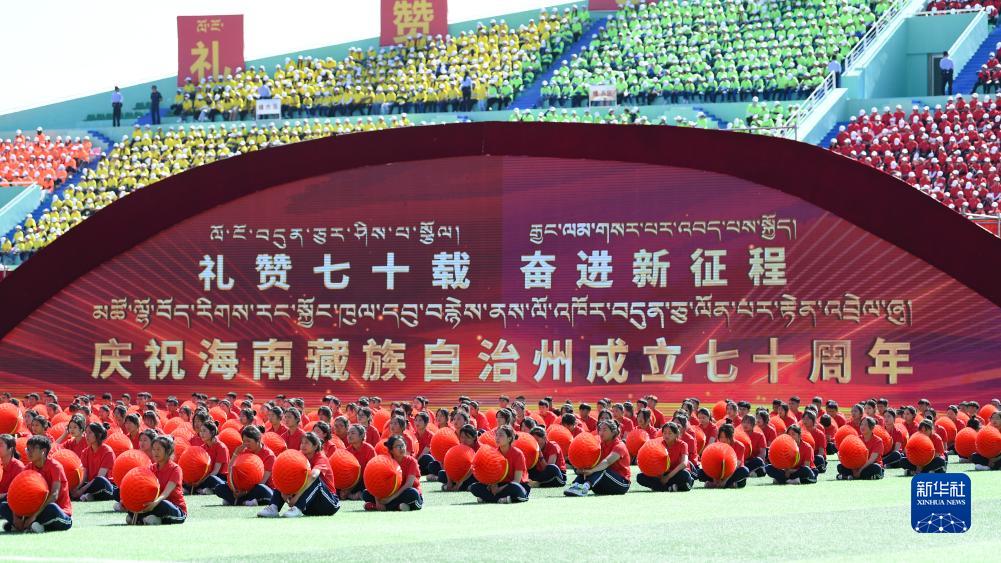 當日,青海省海南藏族自治州舉行慶祝成立70周年大會。海南州民族體育場彩旗飄飄,歌聲悠揚,各族群眾身着盛裝,滿懷喜悅。