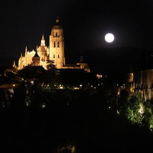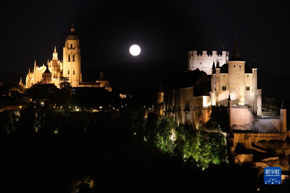 這是8月1日晚在西班牙塞哥維亞拍攝的“超級月亮”和塞哥維亞主教座堂(左)及塞哥維亞城堡。