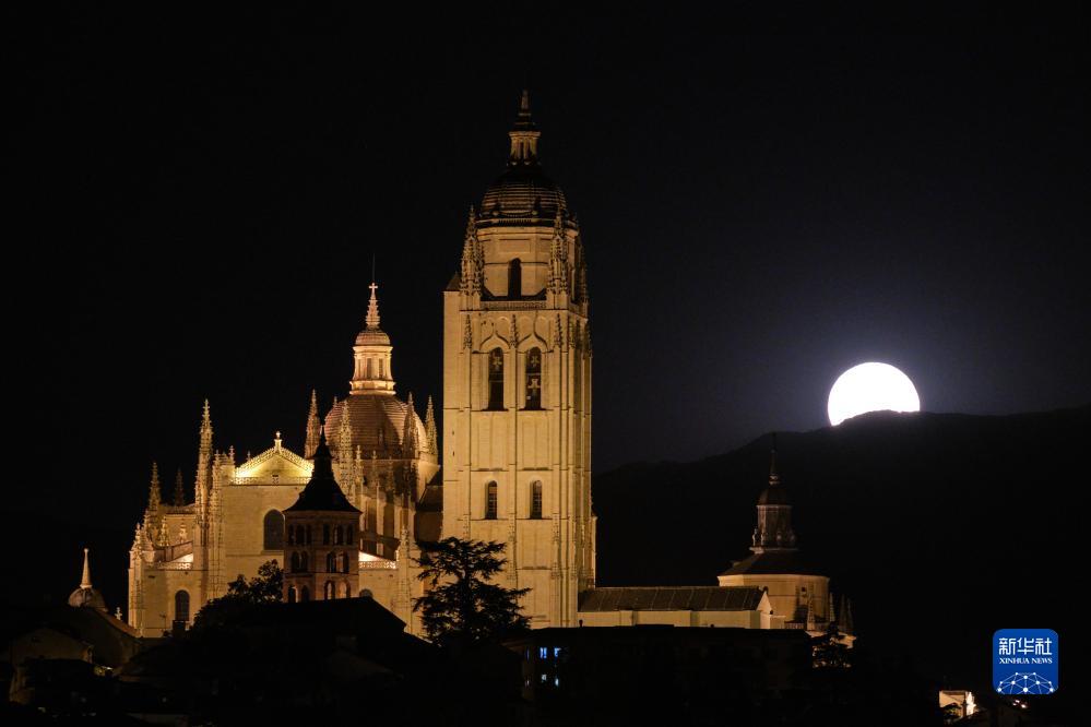 這是8月1日晚在西班牙塞哥維亞拍攝的“超級月亮”和塞哥維亞主教座堂。