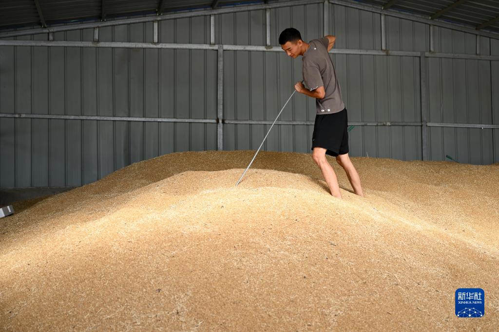 8月1日,在安徽省蚌埠市五河縣澮南鎮楊集村,吳家歡在查看倉庫中小麥的乾燥程度。