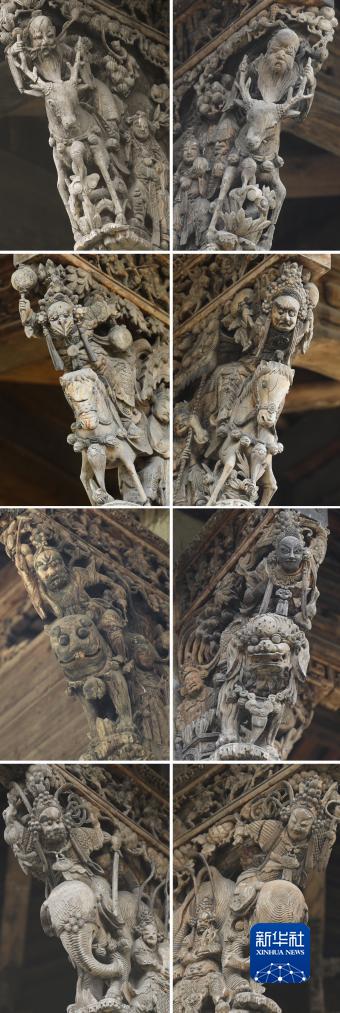 諸葛村丞相祠堂雕刻精湛的“牛腿”(拼版照片,8月1日攝)。