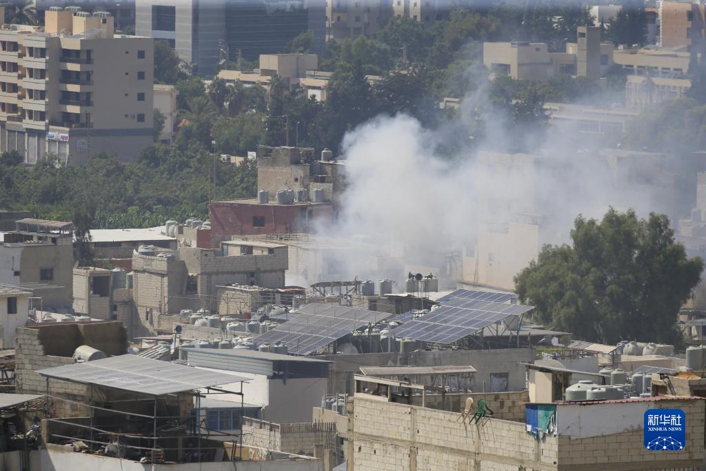 8月1日,在黎巴嫩南部西頓市附近的艾因·哈勒瓦難民營,燃燒的房屋升起濃煙。
