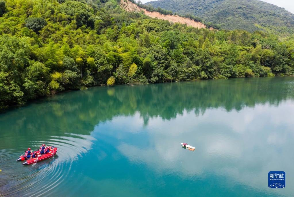 8月2日,浙江省湖州市吳興區道場鄉綜合應急救援隊在水庫開展應急救援訓練,模擬救援落水人員(無人機照片)。