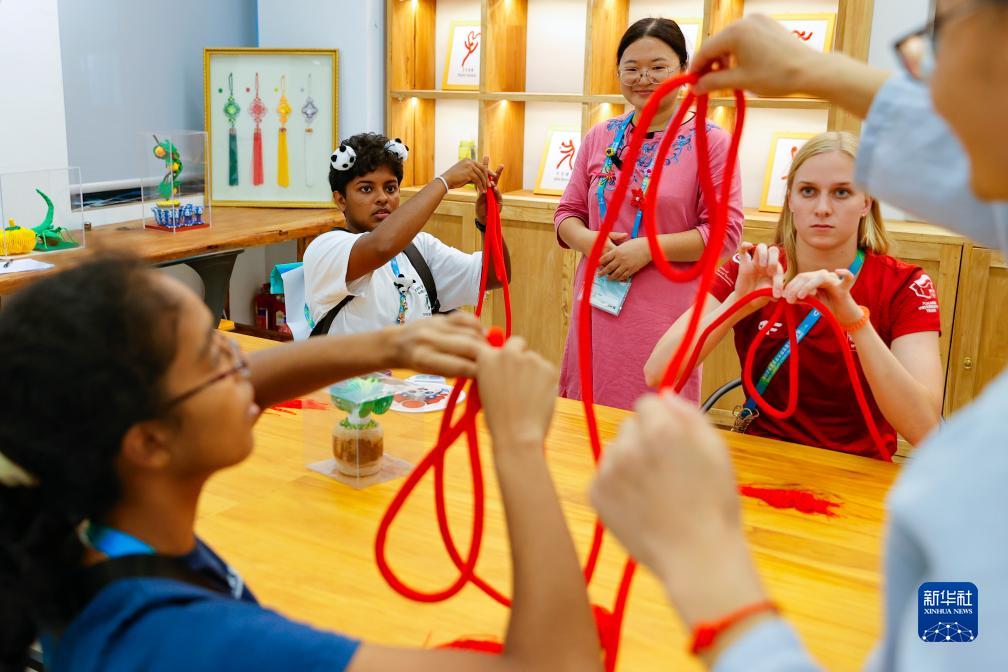 7月31日,在成都大運村,幾名外國代表團成員學習製作中國結。