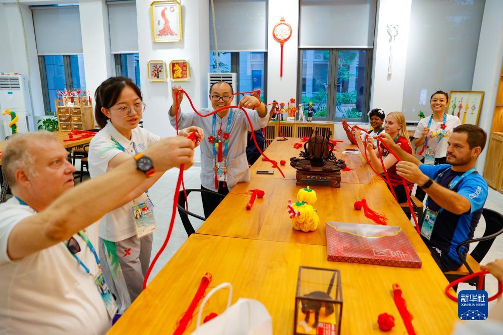 成都大運村裏設置了書法、國畫、蜀繡、傳統樂器等豐富多彩的中國文化互動體驗項目。運動員和教練員在休息之時,紛紛前來感受中國文化的魅力,了解學習中國文化。