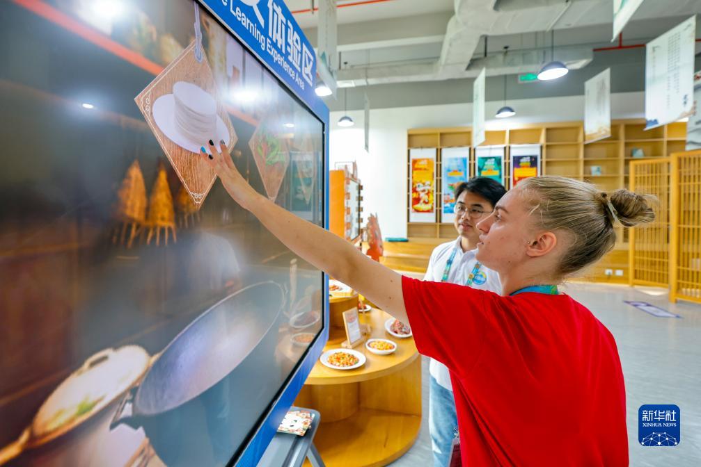 7月31日,在成都大運村的“漢語橋”中文學習互動體驗區,羅馬尼亞運動員斯特凡妮婭-帕特裏夏·克蒂內安通過數字互動電子屏學習做中國菜。