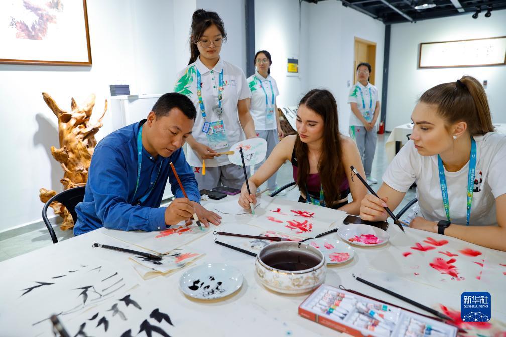 7月31日,在成都大運村,四川師範大學美術學院副教授焦海龍(前左)在為愛沙尼亞運動員阿德利娜(前中)和漢娜(前右)示範中國畫的繪畫技法。
