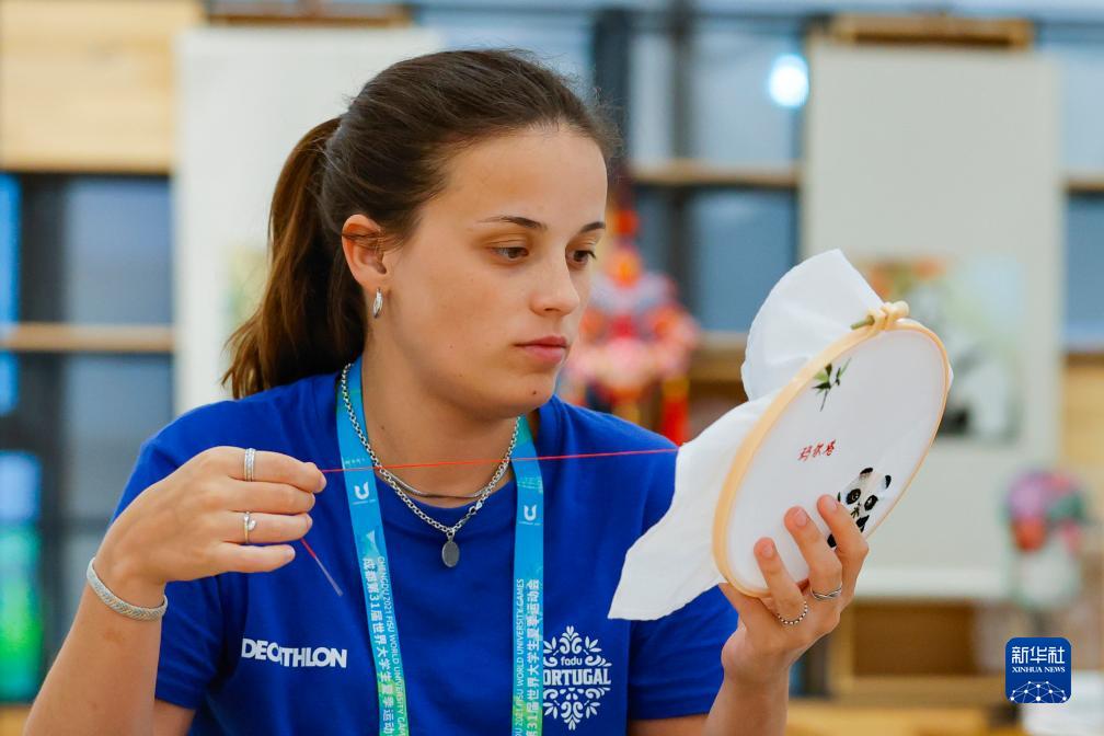 7月31日,在成都大運村,葡萄牙運動員瑪爾塔·卡裏德體驗在蜀繡作品上繡上自己的中文名字。
