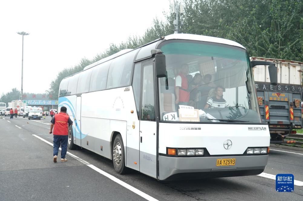 8月2日,在北京市房山區的京港澳高速琉璃河出口,轉運車輛出發前往安置點。