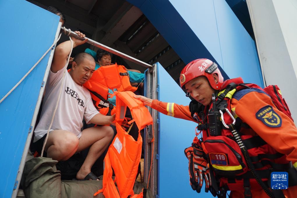 8月2日,在北京市房山區琉璃河鎮平各莊村,消防員向受災群眾遞救生衣。