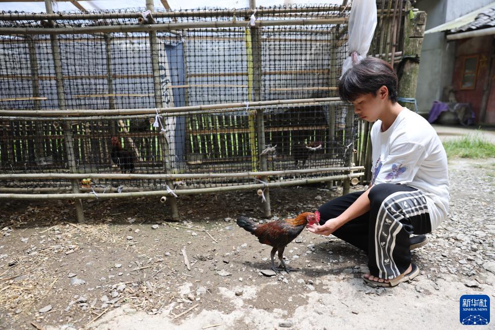 7月30日,在那坡縣百省鄉那布村水弄屯,陶文學在院子裏喂雞。新華社記者李夢馨攝