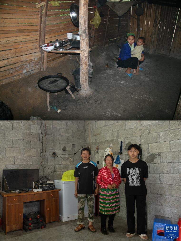 這是一張拼版照片:上圖為2008年11月14日拍攝的陶華強(右)和母親楊衝在茅草屋中合影(新華社記者張愛林攝);下圖為2023年7月30日,陶華強(右)和母親楊衝(中)、父親陶志權在新居裏合影(新華社記者費茂華攝)。新華社發