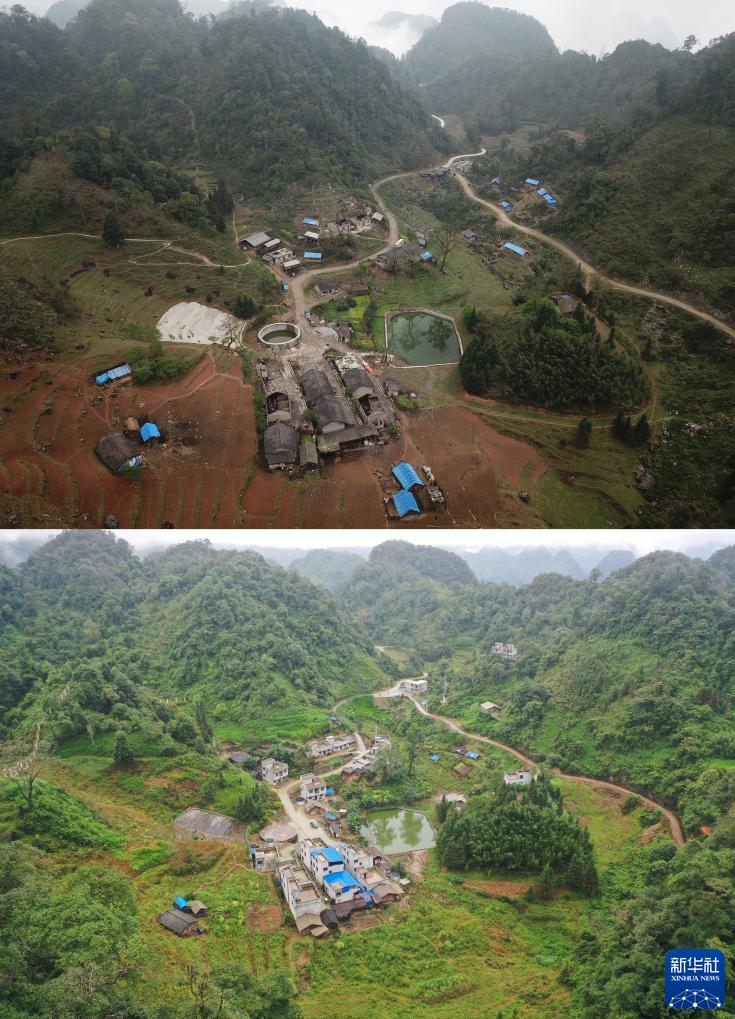 這是一張拼版照片:上圖為2018年3月18日拍攝的水弄屯二社的磚瓦房(無人機照片);下圖為2020年10月16日,改造成鋼筋水泥新居後的水弄屯二社(無人機照片)。新華社記者張愛林攝
