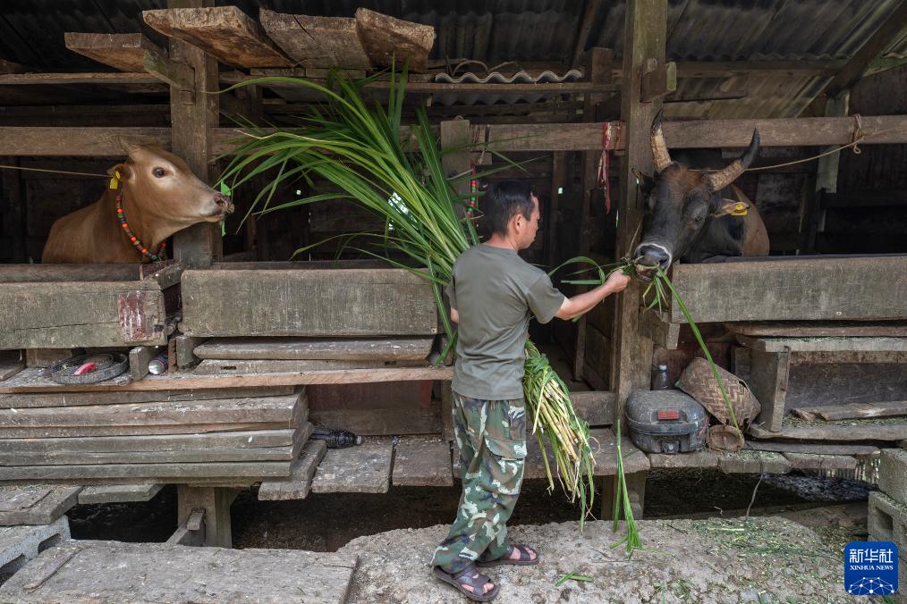 7月30日,陶文學的父親陶建明在喂牛。新華社記者費茂華攝