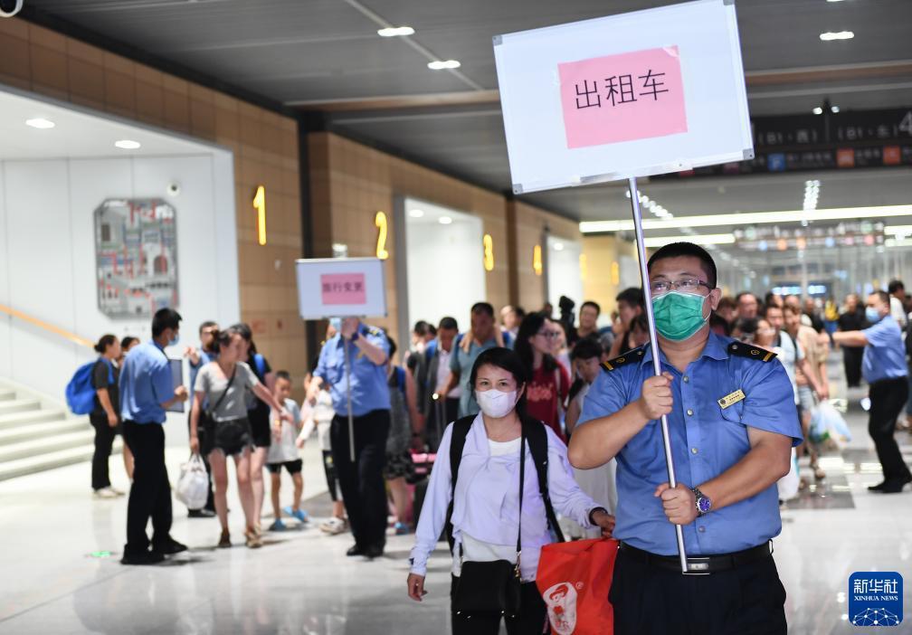 8月2日,北京豐&站工作人員引導K396次列車旅客有序出站。