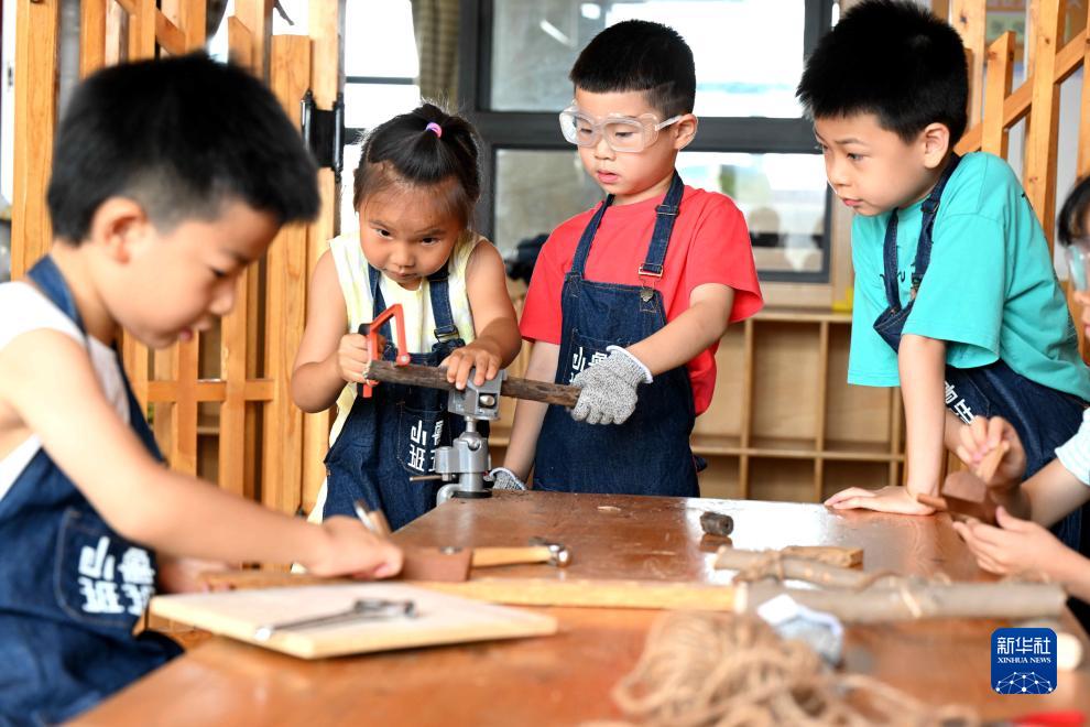 8月2日,小朋友在河北省石家莊市新華區星禾幼兒園體驗木工製作。