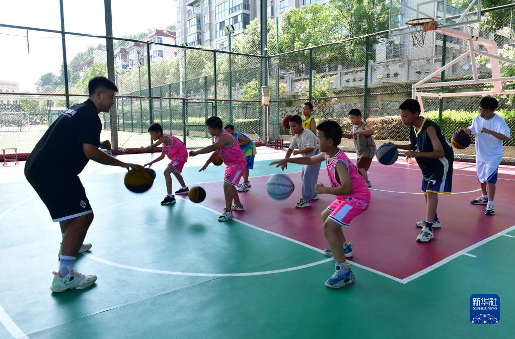 8月2日,在湖北省宜昌市秭歸縣一籃球培訓中心,教練楊皓鈞在教學生練習籃球基本功。