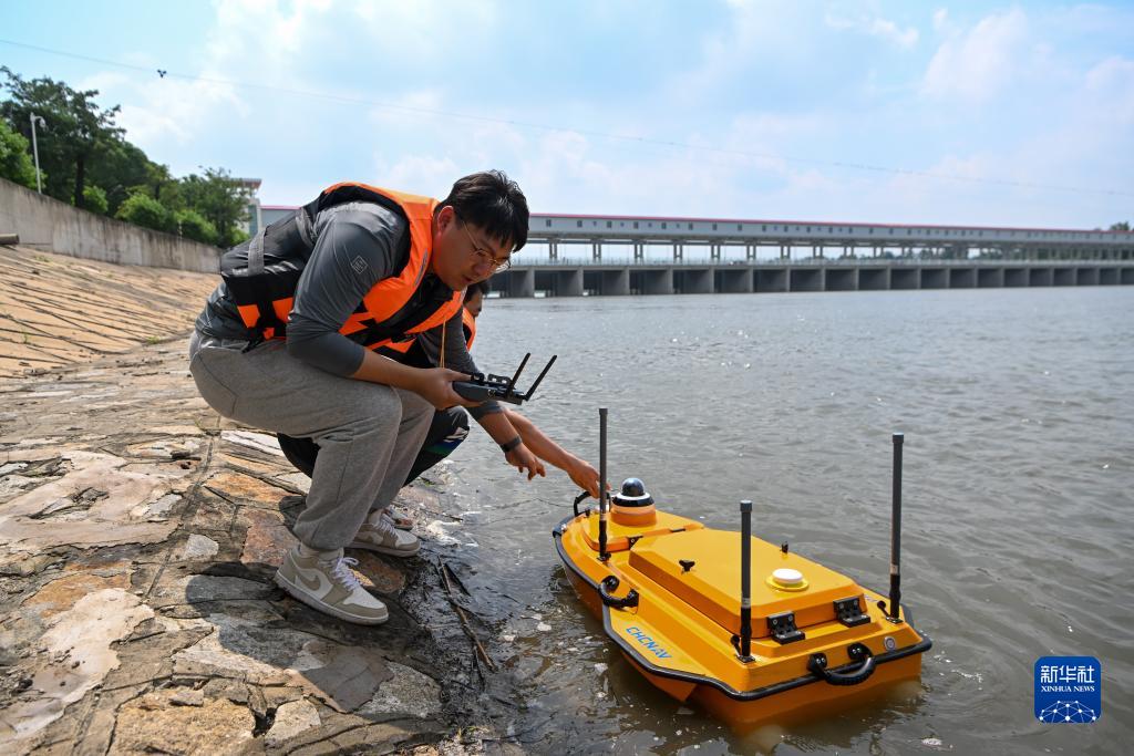 8月2日,在天津市獨流減河進洪閘上游,水文人員在岸邊準備使用無人水文監測船進行水文監測。