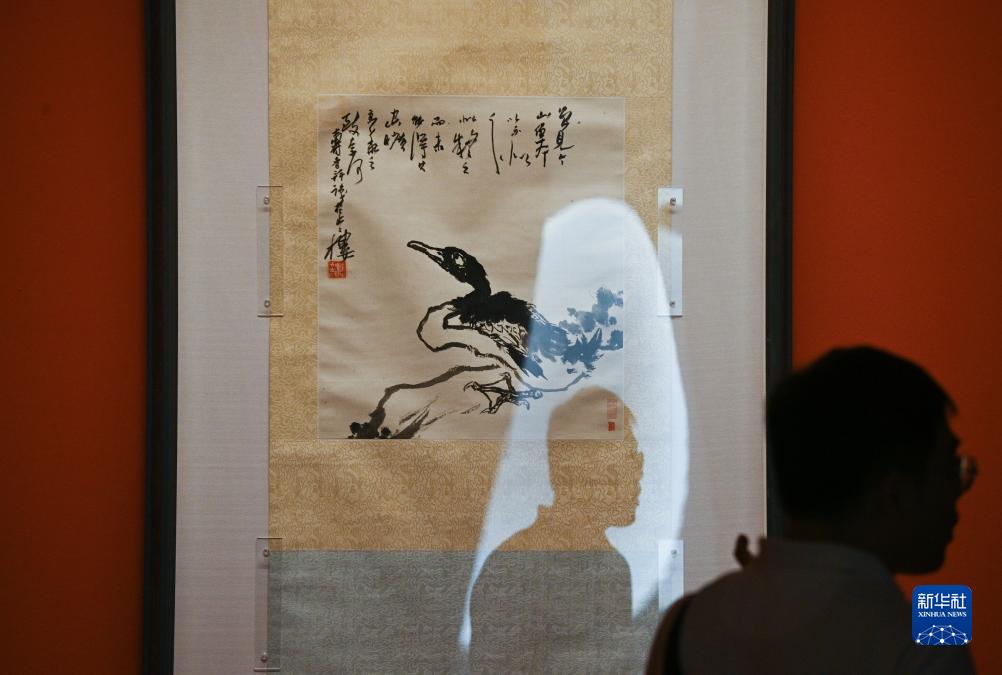 8月2日,參觀者在北京民生現代美術館欣賞潘天壽作品《墨鴨》。