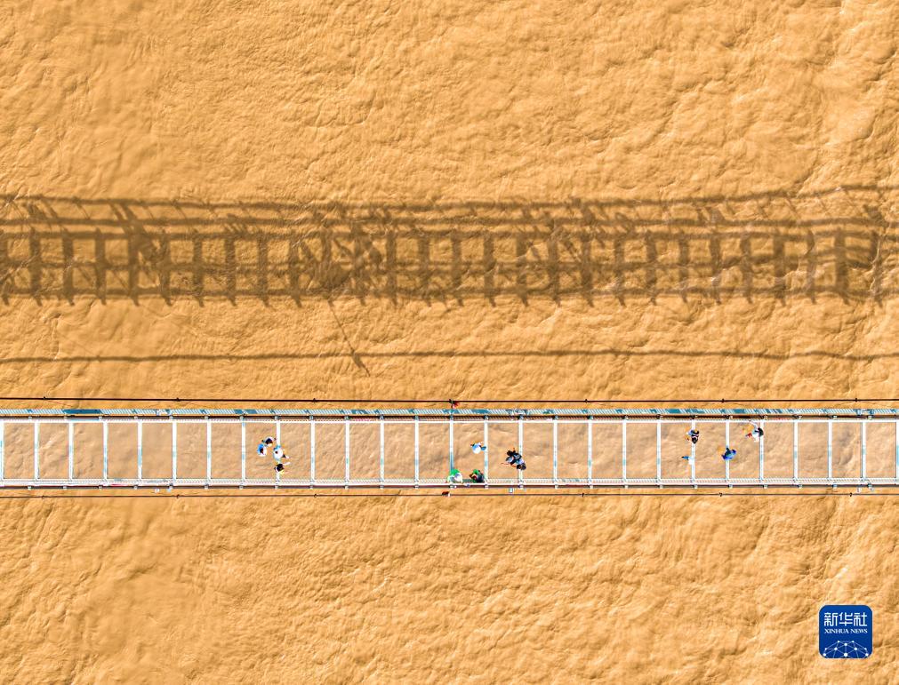 8月2日,游客行走在寧夏中衛市沙坡頭景區玻璃橋上(無人機照片)。