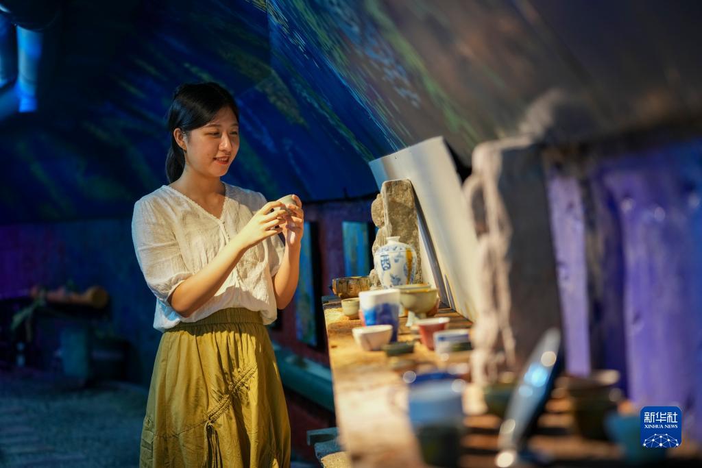 8月2日,一名女孩在重慶市九龍坡區黃桷坪街道的石頭房子藝術空間欣賞各色手工藝術品。
