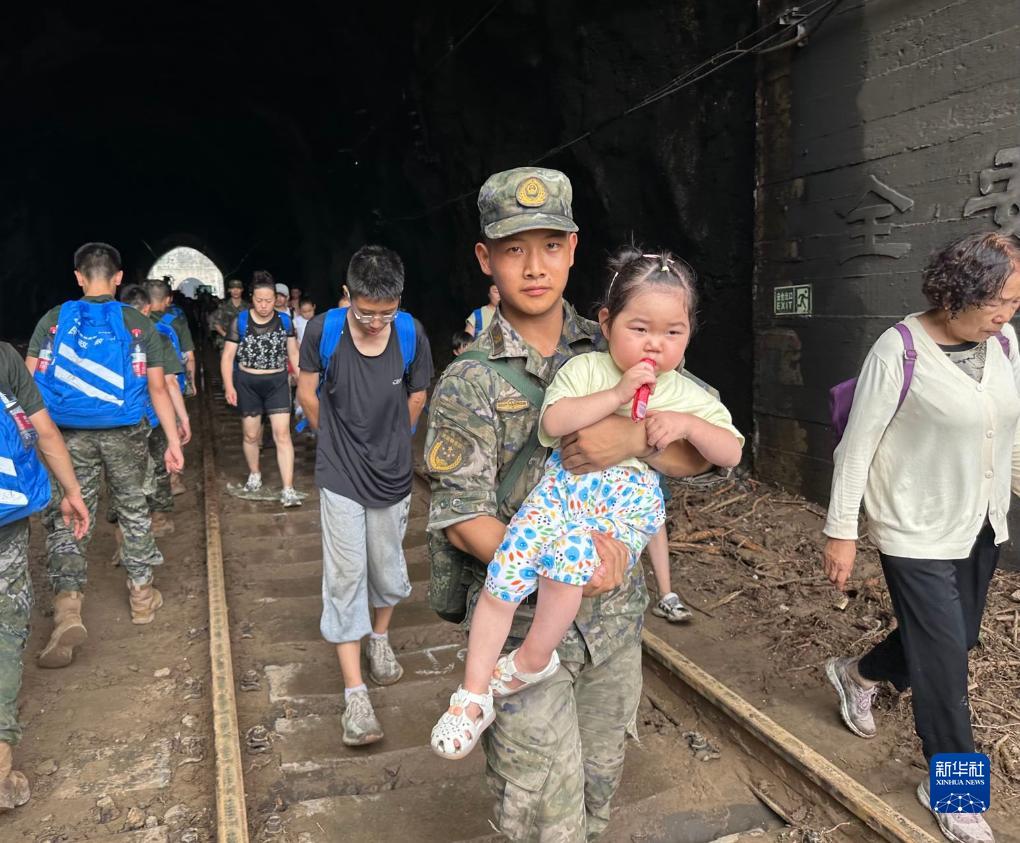 8月2日,受困列車的旅客在武警北京總隊機動第三支隊官兵的幫助下徒步前往轉運客車(手機照片)。