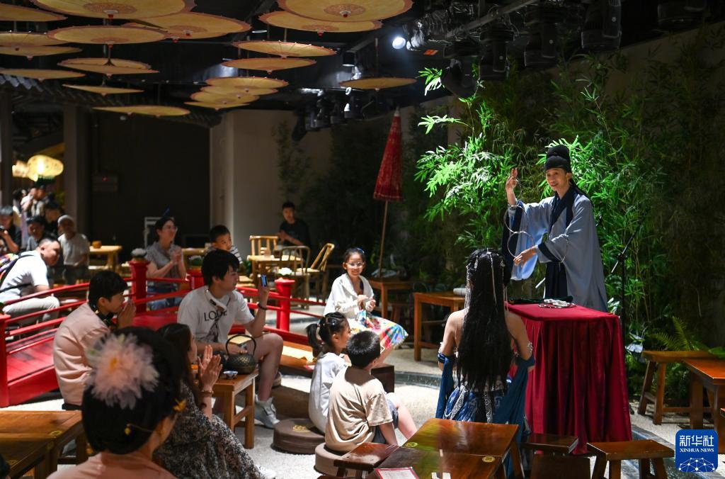 8月2日,游客在長安十二時辰主題街區觀看唐風演藝《大唐曲藝》。
