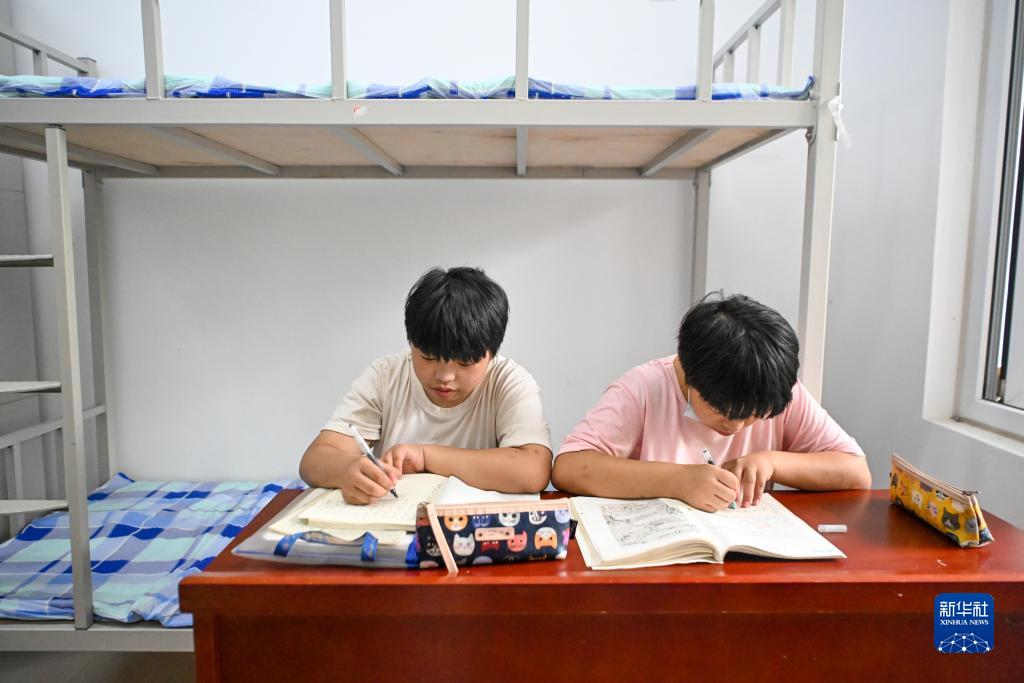 8月3日,在天津市靜海區第六中學臨時安置點,學生在寫作業。