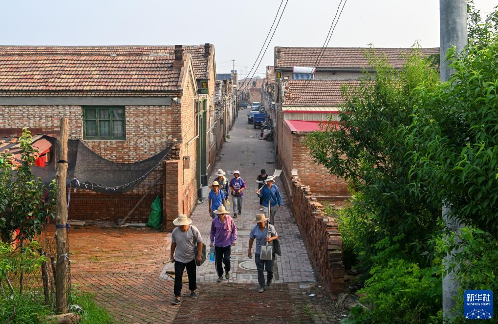 8月3日,在天津市靜海區&頭鎮建設村,村民從村內走到河岸堤壩上參與堤壩加高加固工作。