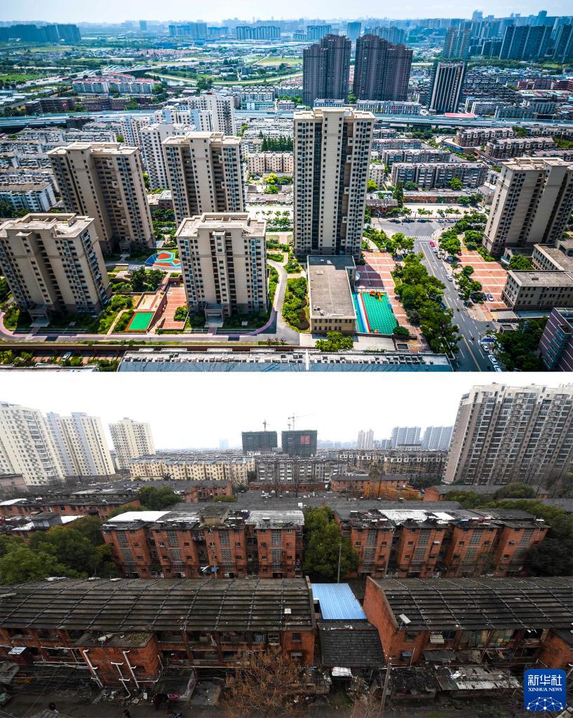 拼版照片:上圖為2023年8月3日拍攝的改造後的合肥市瑤海區安拖東村及新莊城中村改造項目(無人機照片);下圖為2015年3月拍攝的未改造前的安拖東村及新莊城中村舊貌。