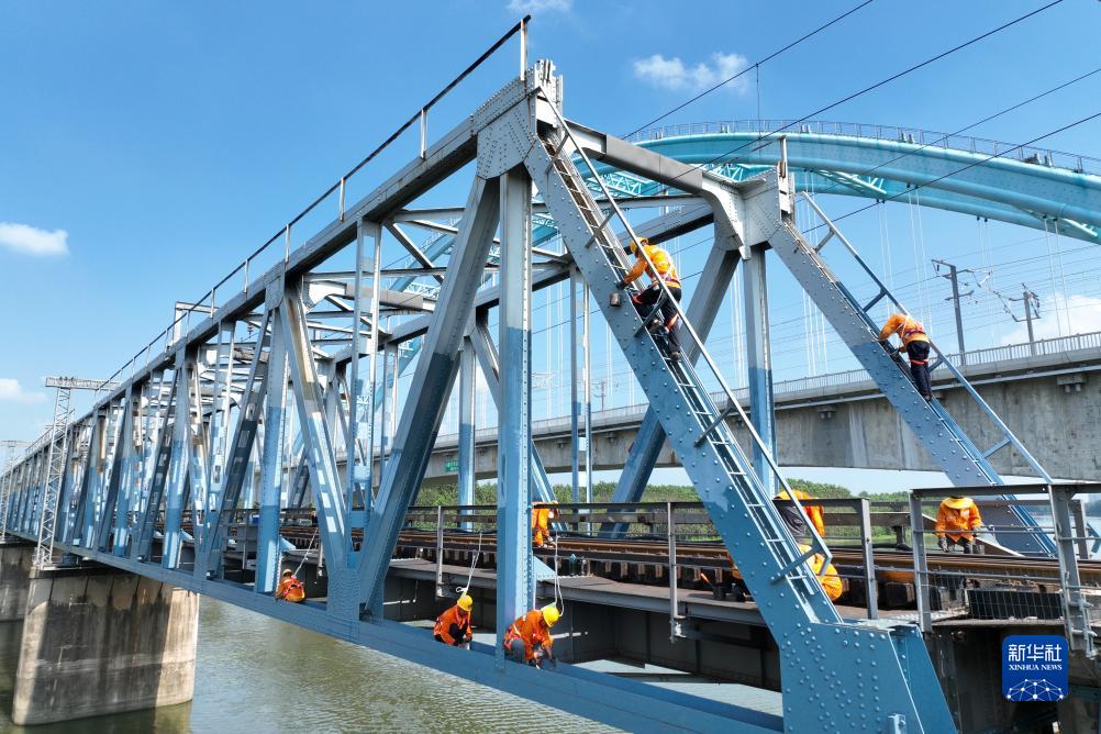 8月3日,中國鐵路上海局集團有限公司徐州工務段工作人員對鋼梁進行除銹涂漆(無人機照片)。