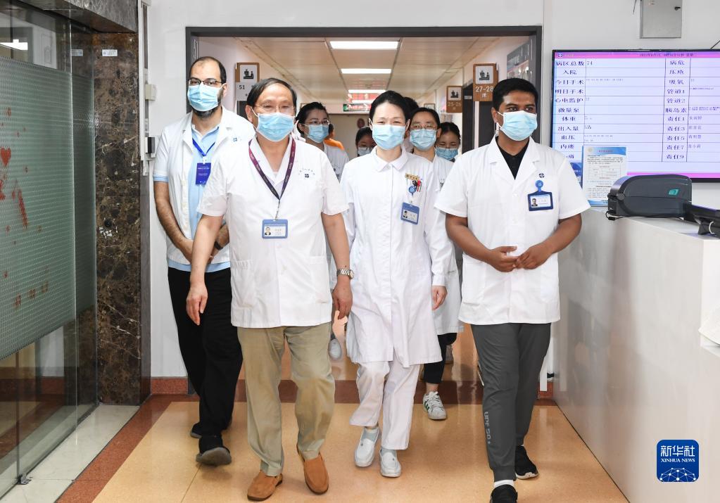 8月1日,在江蘇省人民醫院消化內鏡科,主任醫師範志寧(前左)帶着來自埃及艾因夏姆斯大學醫院、中埃聯合培養的博士生穆罕默德·哈斯基亞(後左)等查房。