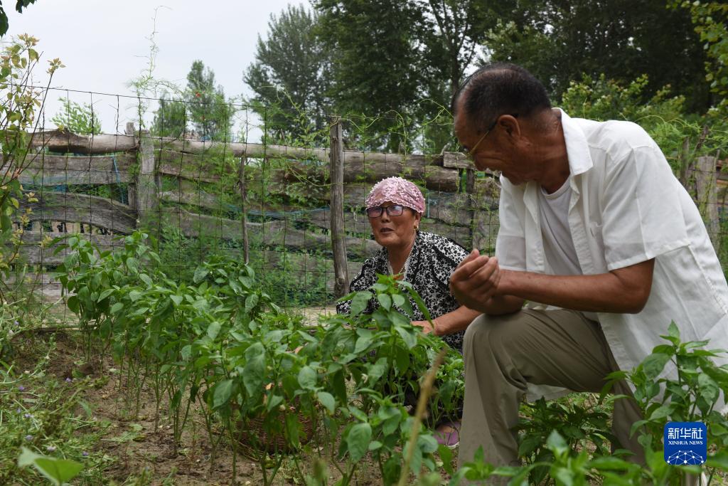 8月2日,百順和老伴正月在家裏的小菜園勞作。