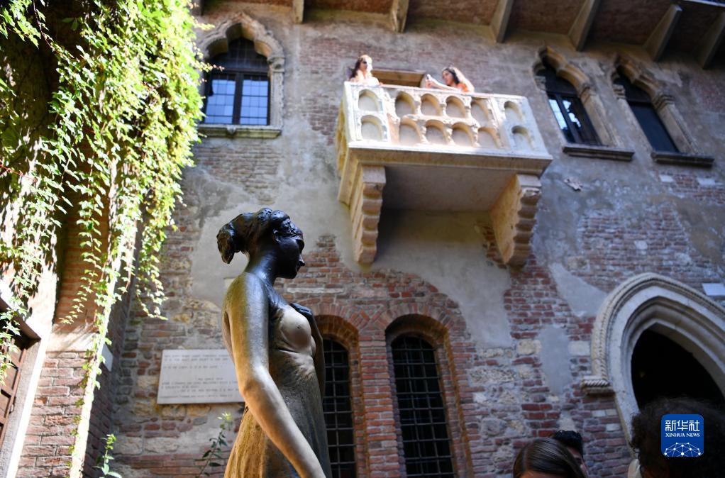 這是8月2日在意大利維羅納的“朱麗葉故居”內拍攝的朱麗葉銅像和朱麗葉的陽&。