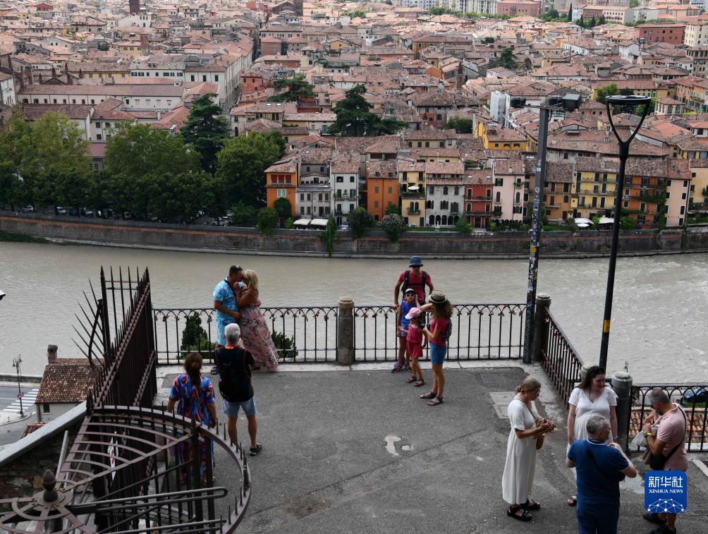 8月3日,游客在意大利維羅納阿迪傑河畔觀光。