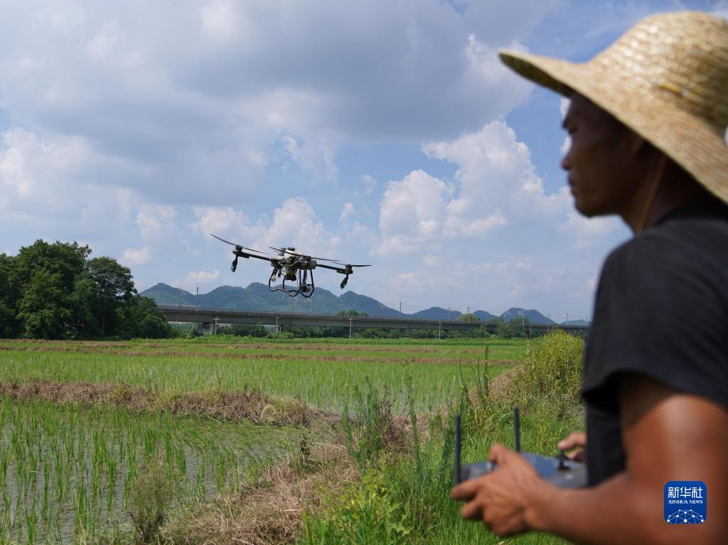 江西省新餘市分宜縣的農戶操作無人機噴灑葉面肥(8月3日攝)。