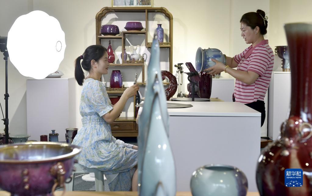 8月3日,河南省禹州市神垕鎮一家鈞瓷企業的工作人員通過手機直播銷售鈞瓷作品。