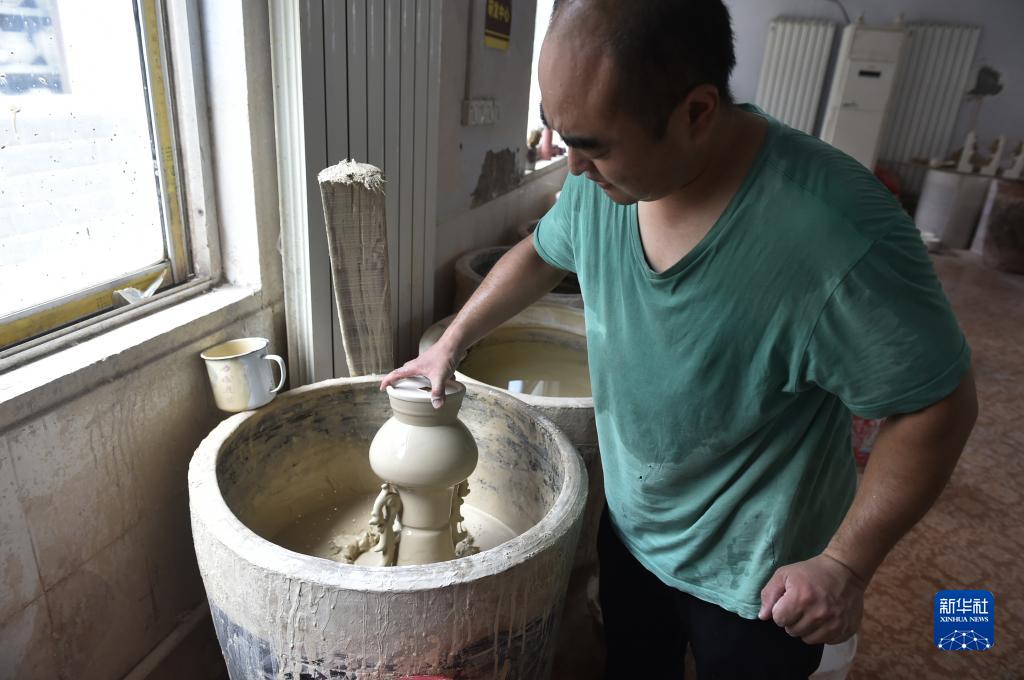 8月3日,河南省禹州市神垕鎮一家鈞瓷企業的工作人員在車間裏施釉。