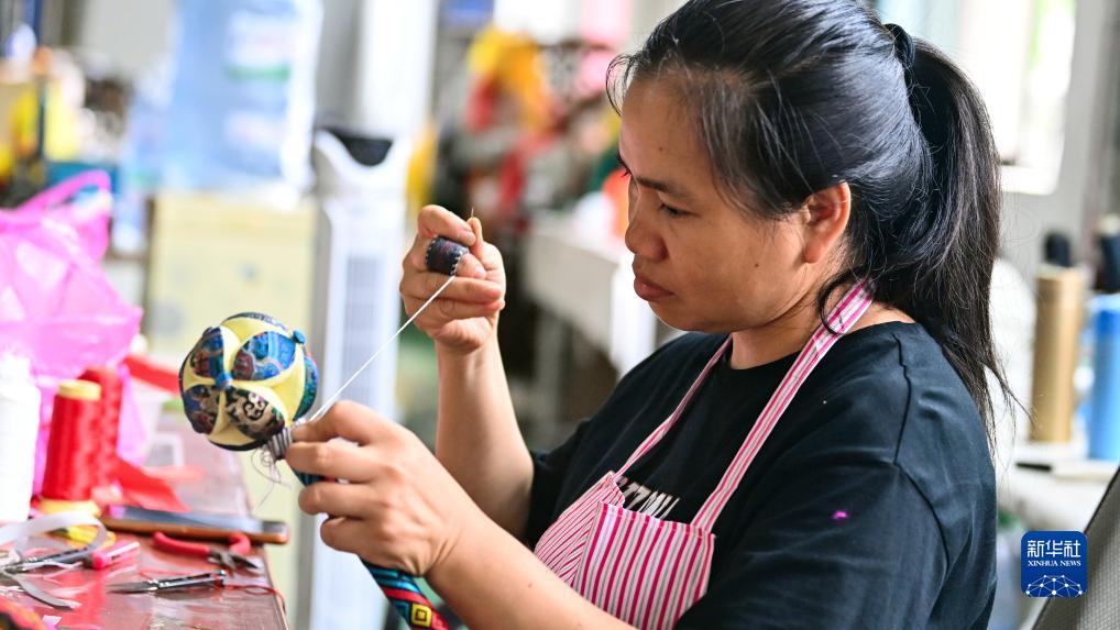 在靖西市舊州村,繡娘在填充縫合繡球(8月2日攝)。