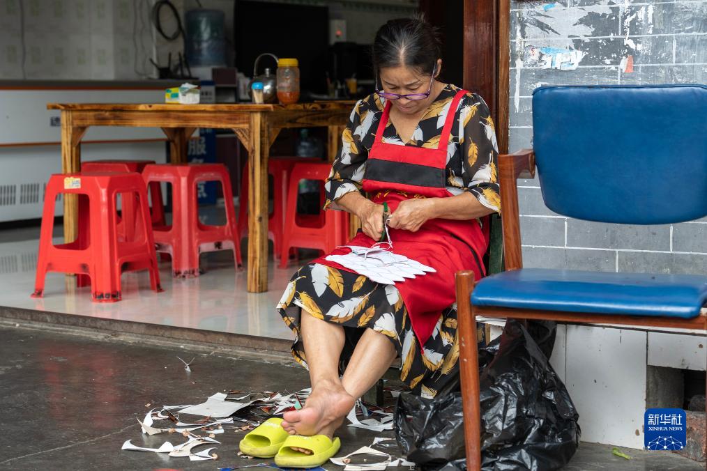 8月2日,在靖西市舊州村,一名開飯館的村民在製作繡球。