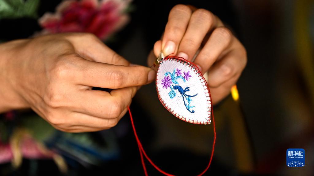 在靖西市舊州村,一名繡娘在手工繡花(8月2日攝)。