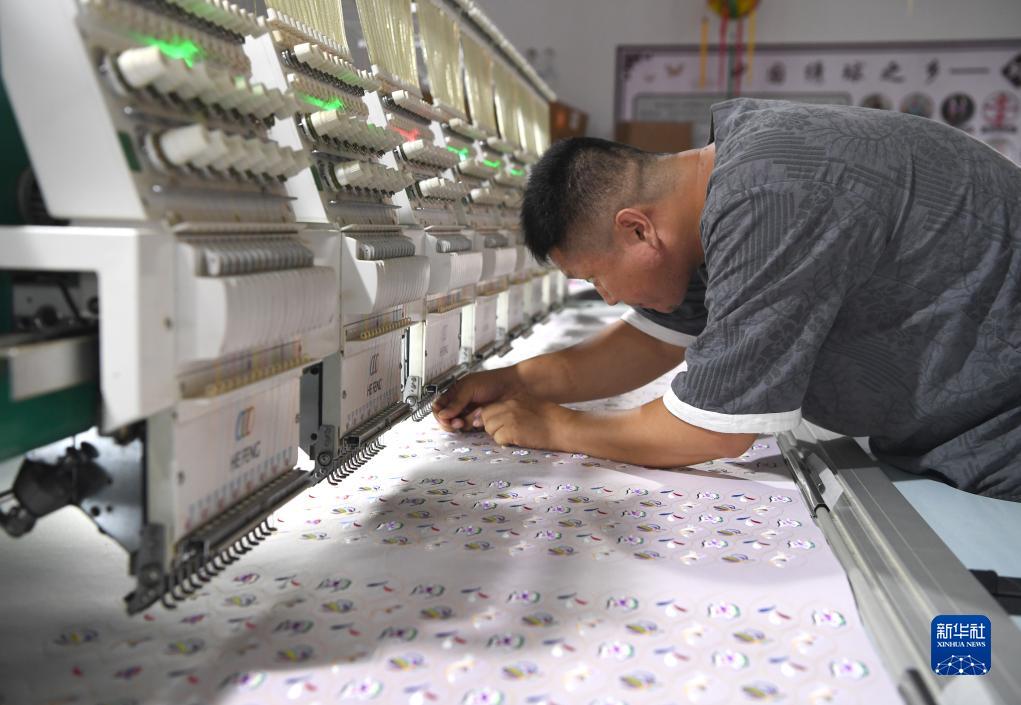 工人在靖西市繡蘊坊繡球文化有限公司用機器剪裁製作繡球所需布料(8月2日攝)。