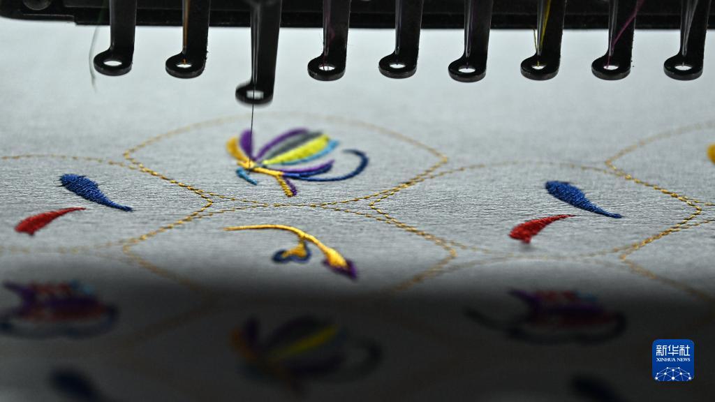 在靖西市非遺傳承人王秀芬繡球製作車間,機器在繡花(8月2日攝)。