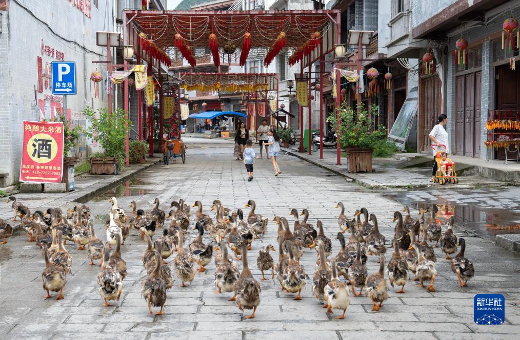 8月2日,在靖西市舊州村,一群鴨子走在大街上。