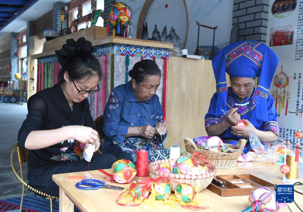 靖西市非遺傳承人王秀芬(左一)在舊州村和村民一起製作繡球(8月2日攝)。