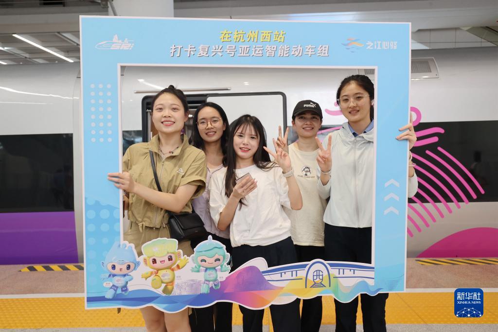 8月4日,在浙江省杭州西站,乘客在復興號亞運智能動車組列車旁合影留念。