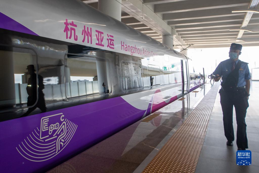 當日,由浙江交通集團購置、為杭州第19屆亞運會量身定制的復興號亞運智能動車組搭載近百名乘客從杭州西站出發,在合杭高鐵湖杭段開啟首次試乘活動。復興號亞運智能動車組採用杭州亞運會主形象色“虹韻紫”涂裝,針對浙江多丘陵山地的地形特點採用定制化的技術創新方案,提升了乘客的乘坐舒適度,將在杭州亞運會賽事期間承擔重要的交通轉運功能。