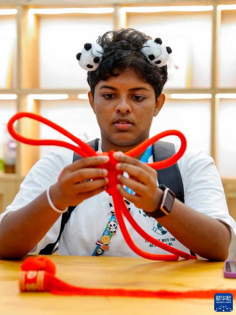 7月31日,在成都大運村的互動體驗中心,斯裏蘭卡運動員哈西妮學習製作中國結。